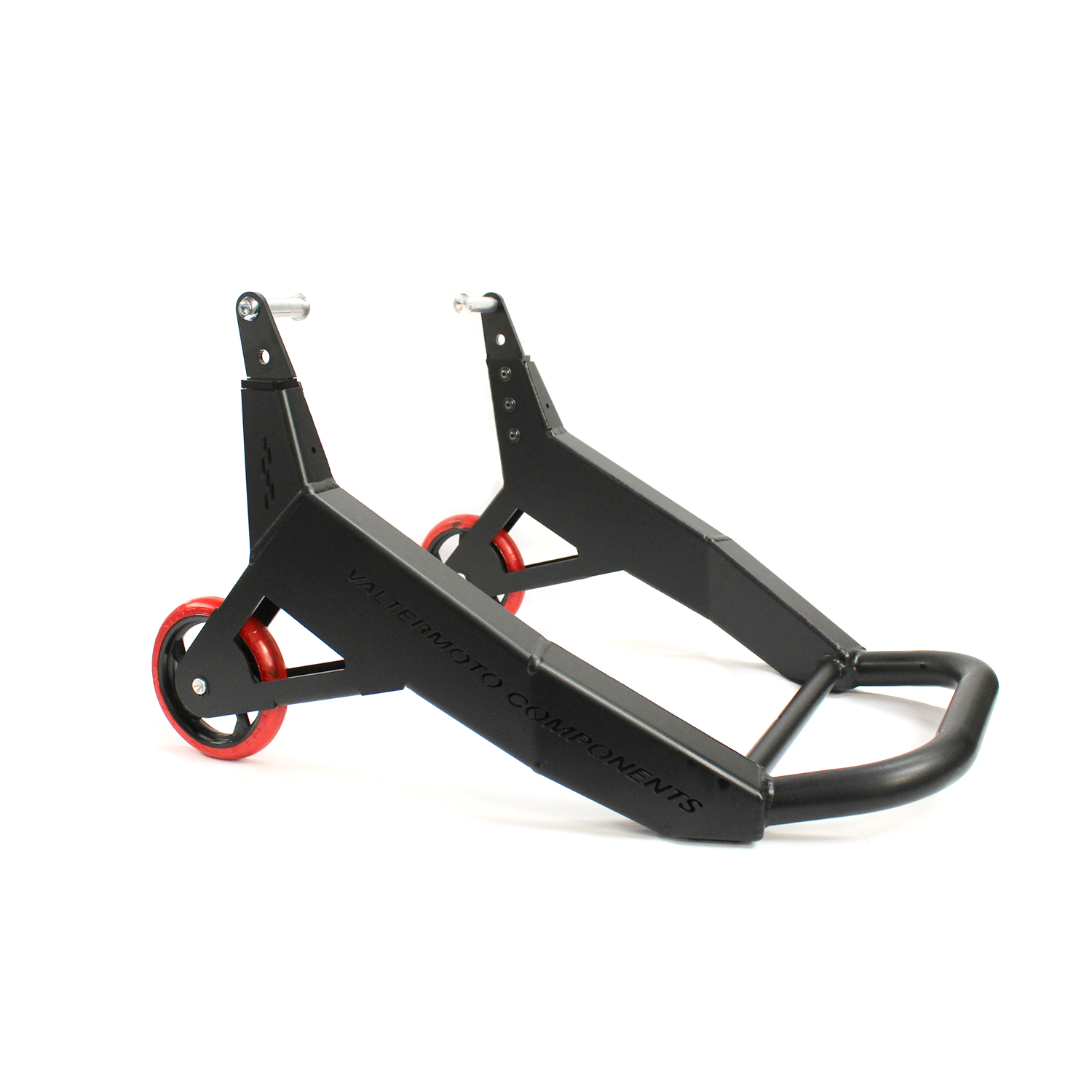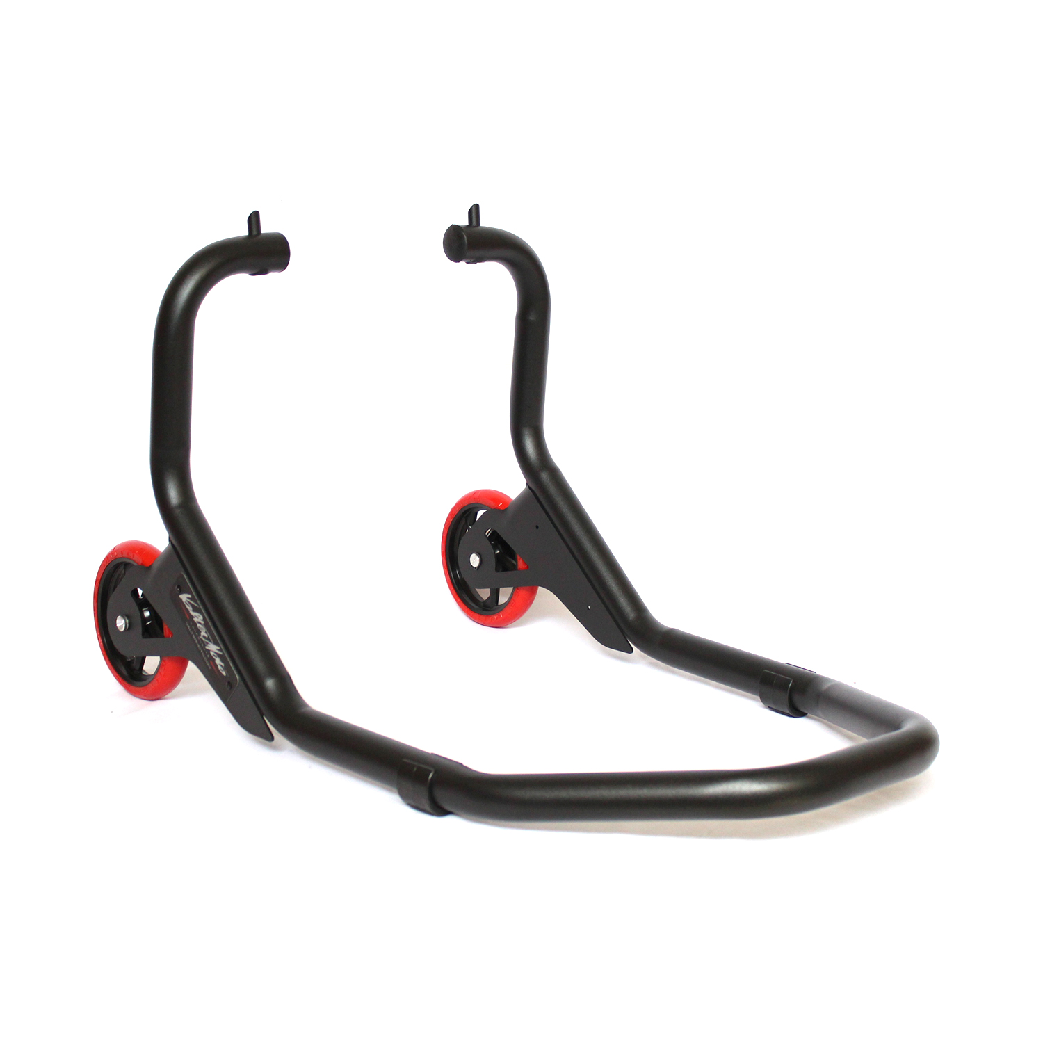 DESCRIZIONE Questo cavalletto anteriore è realizzato in tubi di acciaio resistente saldati a mano e colorati con verniciatura epossidica goffrata per durare nel tempo. È equipaggiato con due ruote realizzate in esclusiva per VMC. Può essere utilizzato con tutti i modelli di moto che hanno il foro sotto il piede della forcella. La larghezza è regolabile manualmente per l'utilizzo su tutte le moto.
