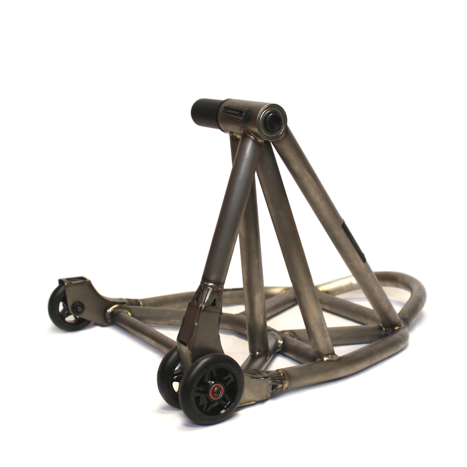 Il cavalletto posteriore a forchetta Titanium è utilizzato da molti Team in diversi campionati mondiali e nazionali. Questa tipologia di cavalletto è il più popolare perchè si adatta a tutti i modelli di supporti cavalletto posteriore in commercio. È interamente realizzato con tubi in Titanio saldati a mano per offrire la massima qualità e leggerezza garantendo la durata nel tempo. È equipaggiato con 4 ruote in alluminio montate su microcuscinetti e fissate alla struttura con viti in Titanio. La larghezza del cavalletto è regolabile manualmente per l'utilizzo su tutte le moto di media/alta cilindrata. KG 2,50